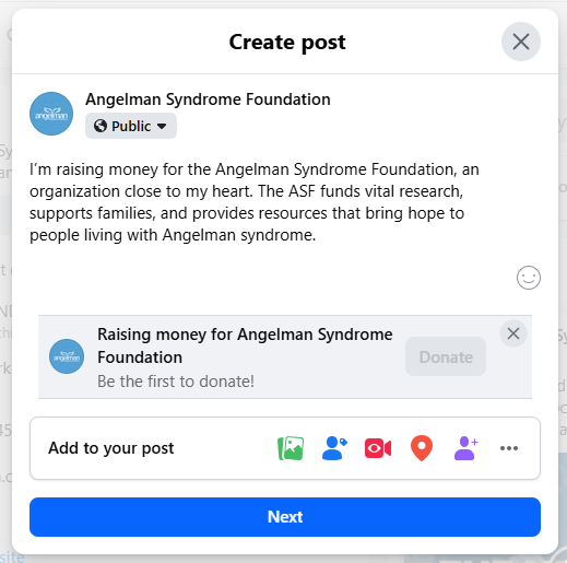 Customize a page with a photo and story about why you support the Angelman Syndrome Foundation.